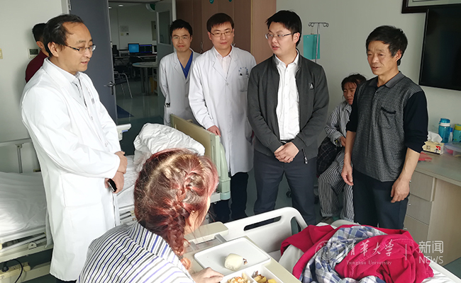 固原市隆德县副县长樊学双(右二)在一附院党委书记类延旭(左一)的陪同下看望患者。