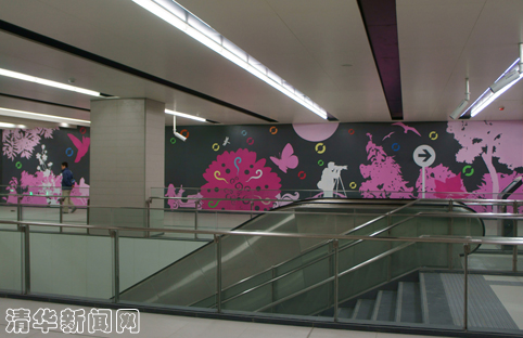 壁画紧密结合地铁站厅的装修设计,在艺术处理上采用了简洁平面化的影像叠加方式,其轮廓化的剪影式的造型语言则可以给观众以更多的遐想空间去填充,丰富变化的外形使画面简约而不呆板;在色彩处理上,将壁画的背景色与站厅墙壁的深灰色瓷砖融为一体,画面中鲜艳的粉红色形象,在深灰色的背景下既突出了主题,又能使整幅壁画沉稳中不失跳跃,艳丽而内敛。作品希望能再次唤醒生活在这个都市里的人们这种美丽的记忆瞬间,在匆忙的行走中放慢你的脚步。