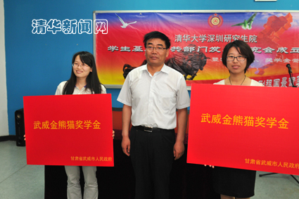 图为连林中为深圳研究生院2013届选调武威的闫玉娟、朱永园颁发“武威金熊猫奖学金”。杨 昊 摄