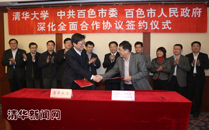 清华大学党委常委、组织部长李一兵,百色市委常委、秘书长黄建宁分别代表双方签署《清华大学-中共百色市委、百色市人民政府深化全面合作协议》。