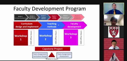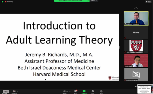 哈佛医学院师资培训项目课程负责人杰里米·理查兹(Jeremy Richards)介绍了2021年清华大学临床医学院师资培训项目的整体计划、培训主题与内容、第一次工作坊的培训内容、授课师资、作业与考试要求、课程答疑等详细安排。