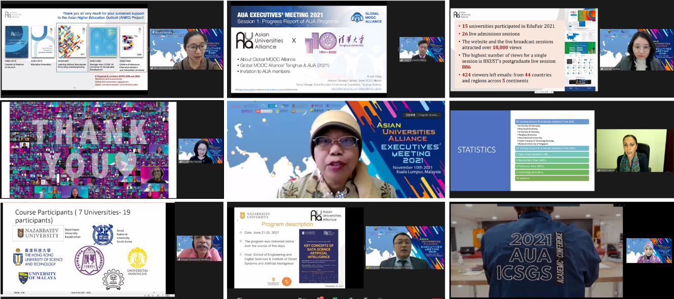 会上,清华大学、朱拉隆功大学、纳扎尔巴耶夫大学、阿联酋大学、印度理工学院孟买分校和印度尼西亚大学的代表向执委会汇报了各校组织的联盟项目简况。亚洲大学联盟秘书处主任方艳华汇报了联盟于今年首次举办的联合教育展项目和亚洲经济系列讲座项目。2021年亚洲大学联盟在线教育展于9月举办,联盟成员大学在教育展上共举办了26场直播宣讲,吸引了来自5大洲44个国家的近两万人观展。清华大学招生办公室和研究生招生办公室代表清华大学进行了直播宣讲。2021年亚洲大学联盟亚洲经济系列讲座邀请了包括清华大学经管学院金融系主任何平教授、首尔国立大学商学院Sun Hyun Park教授、北京大学经济学院陈凯副教授在内的15位来自联盟各成员大学的专家学者,通过13场讲座解读疫情后的亚洲经济,受到了联盟各校师生的广泛欢迎。清华大学在线教育中心高级主管黄尔诺向执委会汇报了亚洲大学联盟与世界慕课联盟联合举办的“在线教育领导力项目”。亚洲高等教育报告主要作者、清华大学教育研究院钟周副教授向执行委员会汇报了“亚洲高等教育展望”项目的进展,并听取了与会代表对该研究项目的建议。