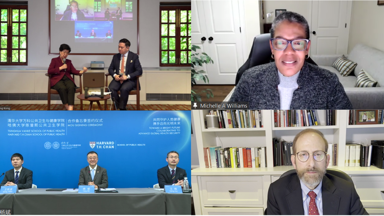 清华新闻网12月3日电 “共同守护人类健康,携手迈向光明未来”——清华大学万科公共卫生与健康学院与哈佛大学陈曾熙公共卫生学院合作备忘录签约仪式于北京时间12月2日上午在线举行。清华大学万科公共卫生与健康学院(以下简称“清华卫健学院”)院长陈冯富珍与哈佛大学陈曾熙公共卫生学院(以下简称“哈佛公卫学院”)院长米歇尔·威廉姆斯(Michelle Williams)分别代表两所院校签署合作备忘录,并围绕合作推动全球公共卫生安全中的挑战、创新与展望进行对话。清华大学副校长、教务长杨斌,哈佛大学教务长艾伦·嘉伯(Alan M. Garber)通过视频连线的方式共同见证签约仪式并发表致辞。