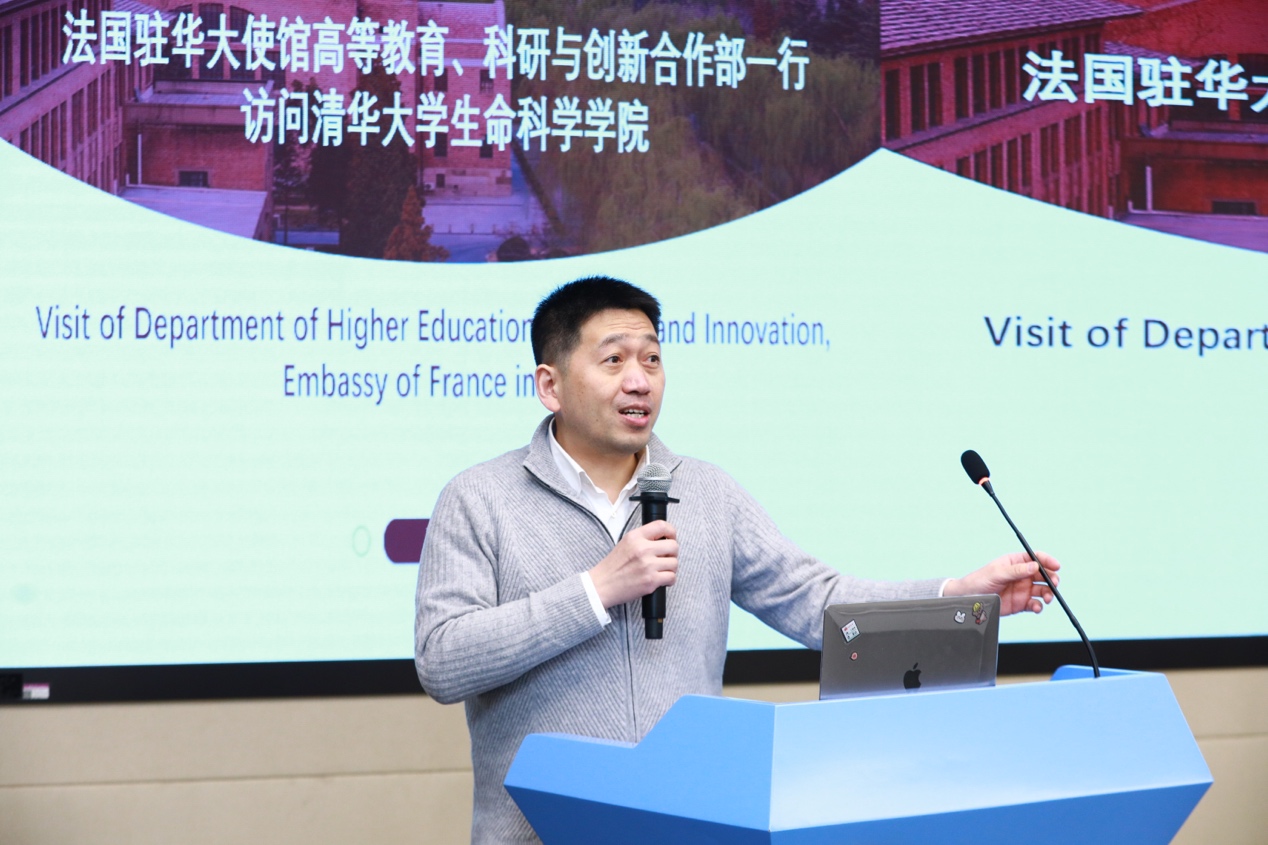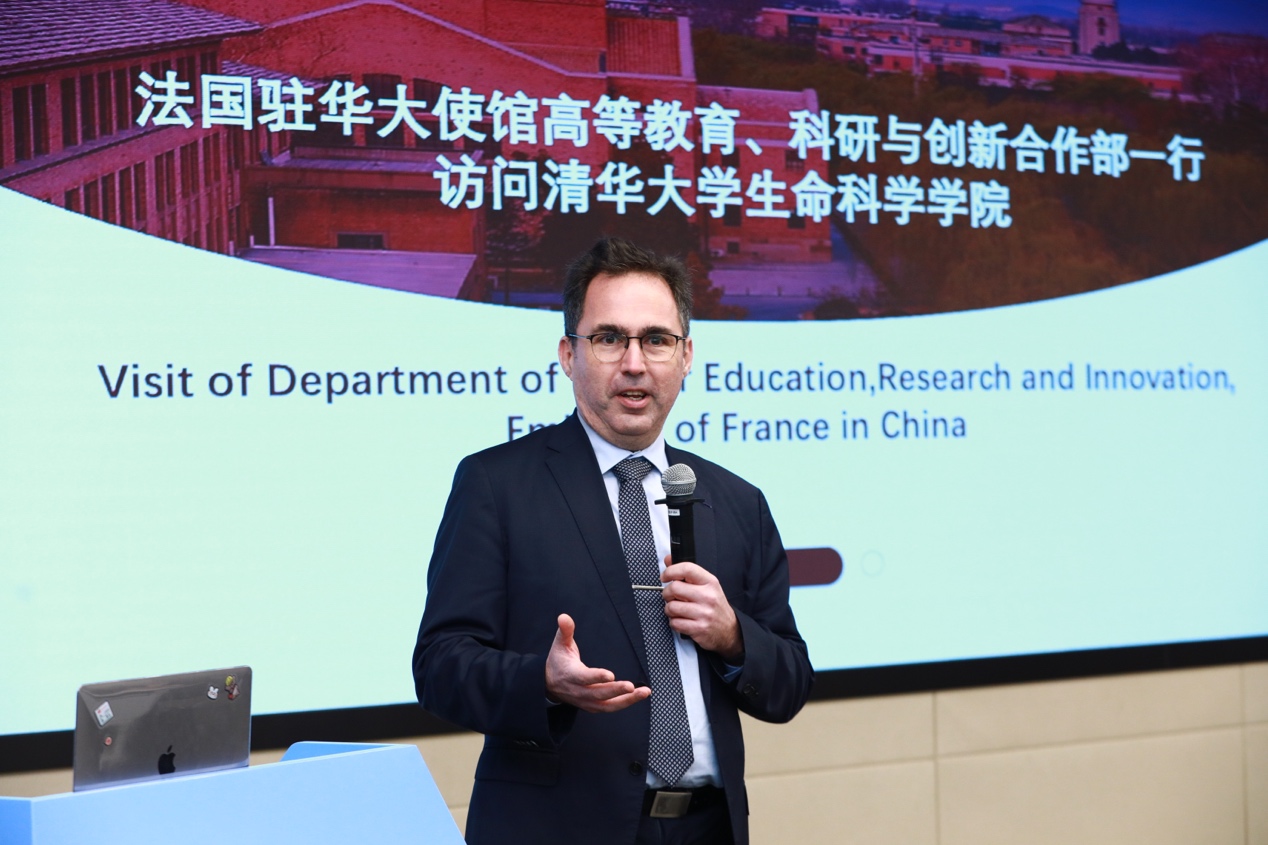 座谈会上,时松海首先对各位嘉宾的到来表示欢迎。他表示,清华大学作为我国最高学府之一,多年来培养了众多科学领军人物,成为中西方科学交流的重要平台。有着95年发展历史和传统的生命学院,也一直致力于探索影响人类发展的重大科学命题。希望通过本次深入交流,进一步增强法方对生命学院的了解,成为推动中法开展高质量合作的新开端。