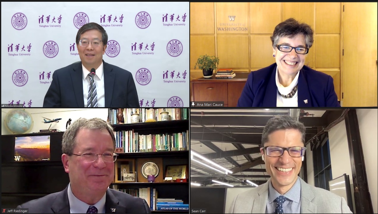 清华新闻网1月21日电(记者 李含)1月20日,清华大学校长邱勇与华盛顿大学校长安娜·玛丽·科斯(Ana Mari Cauce)举行在线会谈,就进一步深化两校未来合作,特别是全球创新学院(Global Innovation eXchange Institute)的相关合作进行了交流。华盛顿大学国际事务副教务长杰夫·瑞丁格(Jeffrey M. Riedinger)、全球创新学院新任执行主任肖恩·卡尔(Sean Carr)、清华大学国际合作与交流处处长郦金梁、全球创新学院院长刘云浩参加会谈。