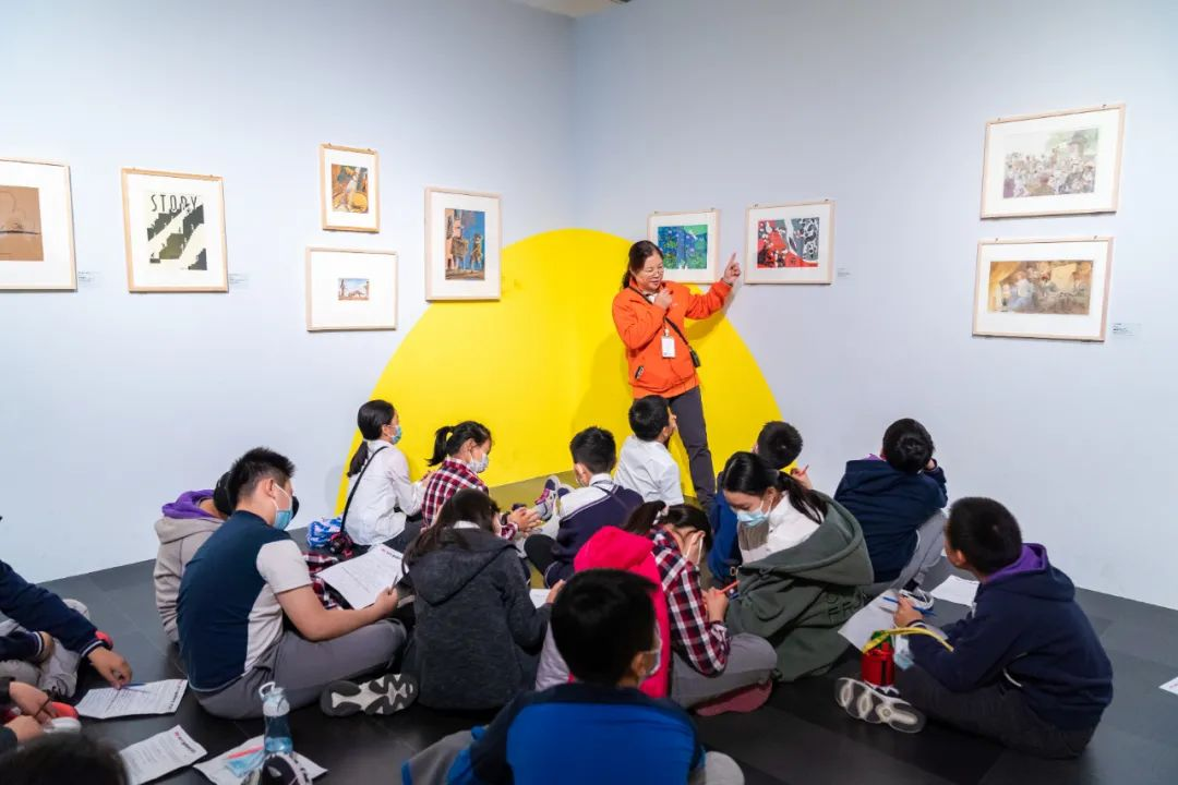 青少年观众正在学习“童思妙笔·耕绘奇境——西方插画师作品展”创造讲解