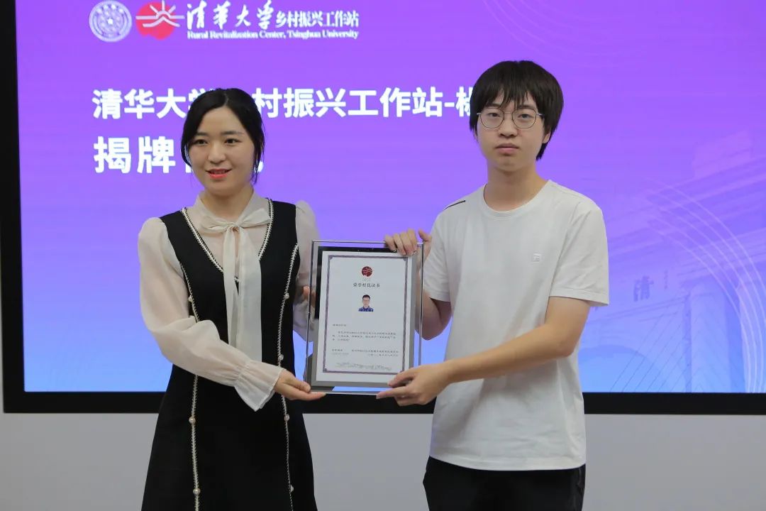 大陈镇镇长蒋瑛为陈锴乐颁发荣誉村民证书,虞晨阳、康润琪、丁月文、陈仪馨、张晨玥、刘逸超、黄超逸、陈曦儿等八名参加大陈镇社会实践活动的清华大学学生也获得了荣誉村民称号。