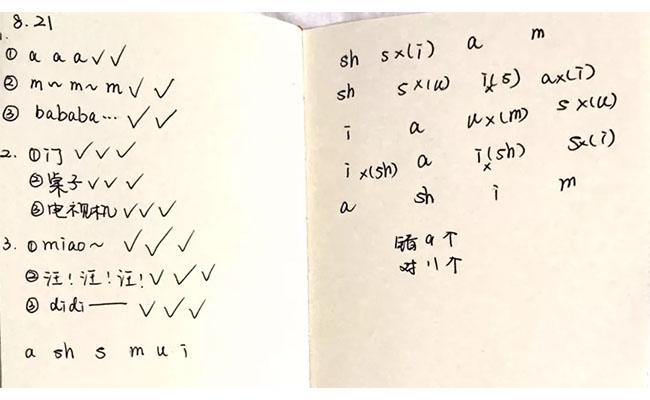 现在她每晚都做1-2个小时的语训。在8月21号的笔记上,她记录下了当天学了“a a a”“m m m”“ba ba ba”,也学了“门”“桌子”“电视机”三个词,还学了“miao”“汪汪汪”“didi”,但听错了“i”“s”。那天她对了11个,错了9个。她也盘算着买一个“音质不失真”好一些好音箱,帮助她更好地听声音做训练。