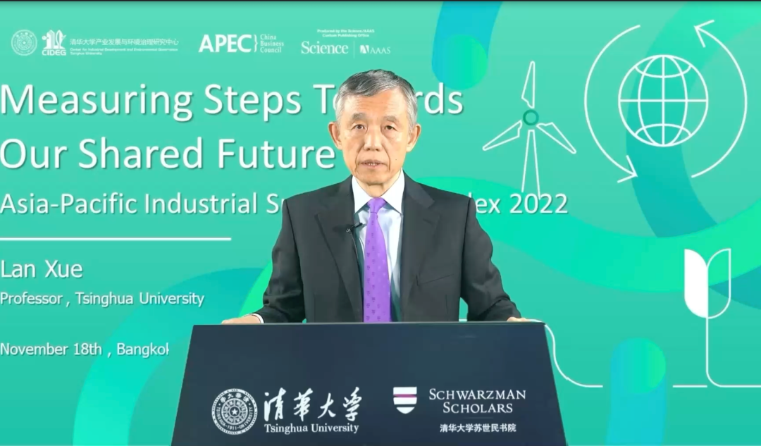 11月18日,APEC第二十九次领导人非正式会议(APEC Thailand 2022)上,薛澜受邀在“亚太繁荣的绿色机遇”主题活动上作“循序渐进,同向未来——亚太城市产业可持续性指数2022”(Measuring Steps Toward Our Shared Future: Asia-Pacific Industrial Sustainability Index 2022)的视频发言。
