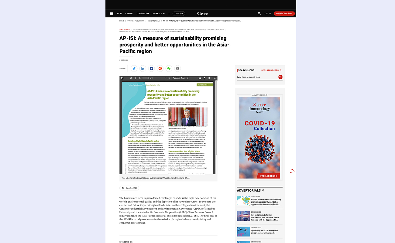 《亚太城市产业可持续性指数》(AP-ISI,Asia-Pacific Industrial Sustainability Index)由清华大学产业发展与环境治理研究中心(CIDEG)和亚太经济合作组织(APEC)中国工商理事会联合发起,由《科学》出版发行。11月18日,AP-ISI 2022英文版在《科学》官网上线,首次面向全球发布。据悉,报告中文版将于今年12月底正式发布。