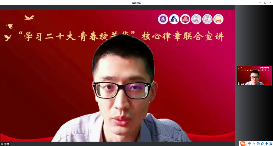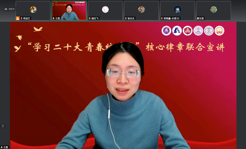 清华新闻网12月7日电(通讯员 彭颖政 李芍毅 杨晓通)11月24日下午,在共青团清华大学研究生委员会、清华大学博士生讲师团的指导下,博士生讲师团水利分团、金融分团、公管分团、人文分团以及武汉大学博士生宣讲团在线上联合举办“学习二十大·青春绽芳华”核心律章系列大型宣讲活动。来自全校各个院系党团支部以及武汉大学的200余位师生参加活动。