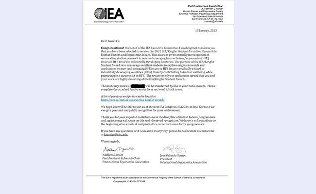 IEA/Kingfar奖为IEA的年度奖项,旨在鼓励优秀学生对与工业发展中国家(Industrially Developing Countries)有关的新兴人因与工效问题加以探索,对相关问题开展研究和应用,为人类福祉作出贡献。该奖项自2019年设立至今,清华大学工业工程系已有两位同学获此荣誉。另一位为工业工程系2019届博士毕业生曹柳星(现为清华大学副教授),她也是该奖项的首届得主之一。