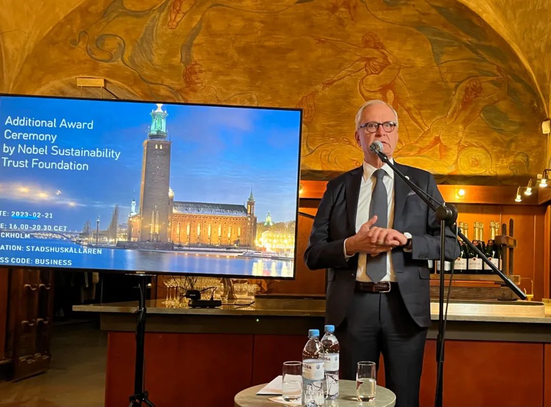 清华新闻网2月22日电 瑞典当地时间2月21日,诺贝尔可持续发展基金会主席彼得·诺贝尔(Peter Nobel)宣布,将首届可持续发展特别贡献奖授予中国气候变化事务特使、清华校友解振华,以表彰他对全球应对气候变化以及可持续发展事业的巨大贡献。中国驻瑞典大使崔爱民以及诺贝尔家族代表等出席颁奖仪式。