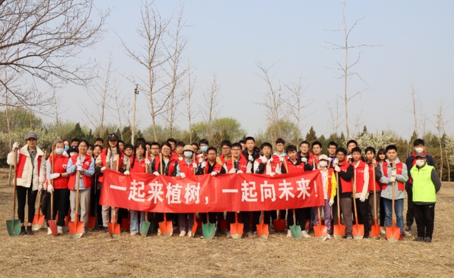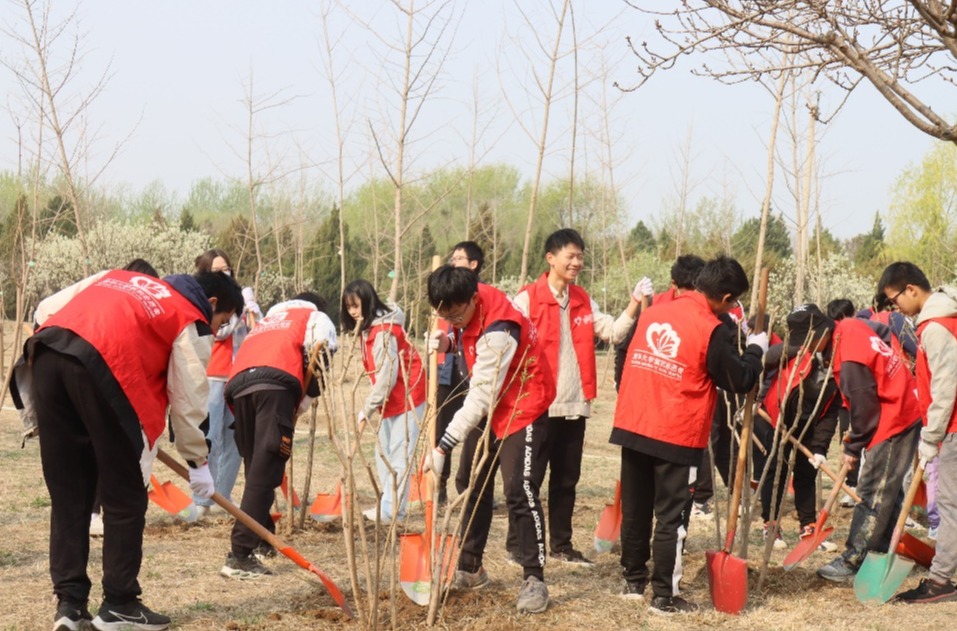 春风拂面,晨光熹微。4月1日上午,80余位同学分别前往朝阳区鸿博郊野公园和延庆区妫水公园开展义务植树活动。在认真学习了植树流程及注意事项后,同学们穿上志愿者红马甲,拿起装备和树苗,投入火热的植树活动。