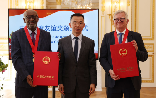 清华新闻网4月23日电 4月19日,中国驻法国使馆隆重举行2022年度中国政府友谊奖颁奖仪式。驻法国大使卢沙野向联合国教科文组织原副总干事、清华大学中国—非洲领导力发展中心联席主席格塔丘·恩吉达和法国蓝星安迪苏公司首席执行官、动物营养学专家让-马克·杜布朗颁发奖章和证书。清华大学副校长王宏伟、蓝星(集团)郝志刚董事长、获奖者亲属及同事,法国科技、教育机构代表及使馆主要外交官等共约50人出席颁奖仪式。