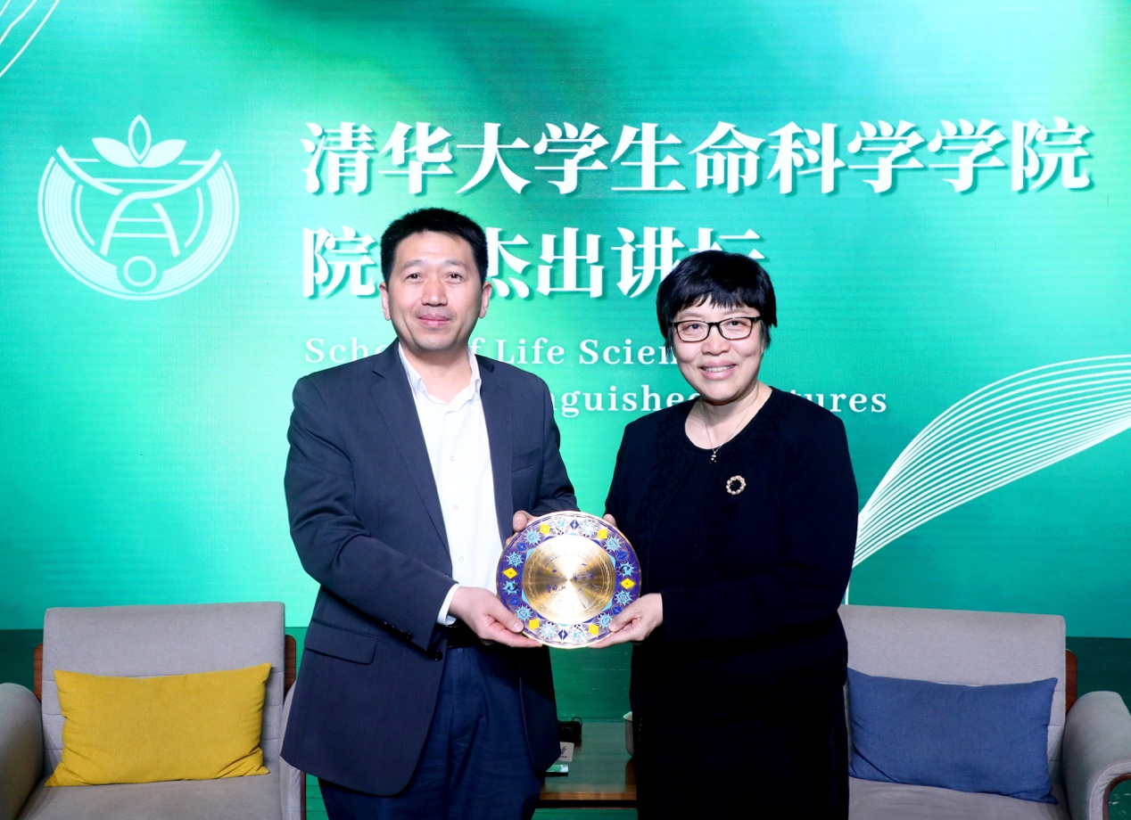 时松海代表学院向曹晓风赠送由生命学院本科生科协和清华大学美术学院学生联合设计的纪念品。