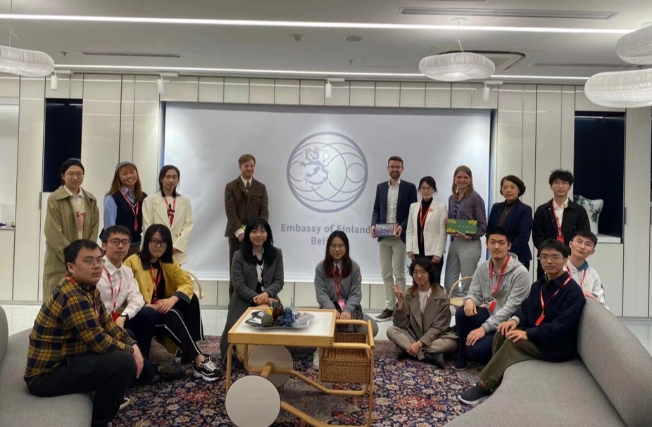 清华新闻网4月26日电 4月20日下午,清华大学本科生通识课程“欧洲媒体、文化与社会”授课教师、新闻与传播学院副院长、欧盟让·莫内讲席教授张莉带领课堂学生参访芬兰驻华大使馆,与芬兰驻华大使馆新闻与文化处参赞何天明(Timo Sysiö)和教育与科学处参赞欧力(Olli Suominen)就芬兰媒体与文化、中芬双边关系、芬兰桑拿外交等话题进行了深入的交流和讨论。