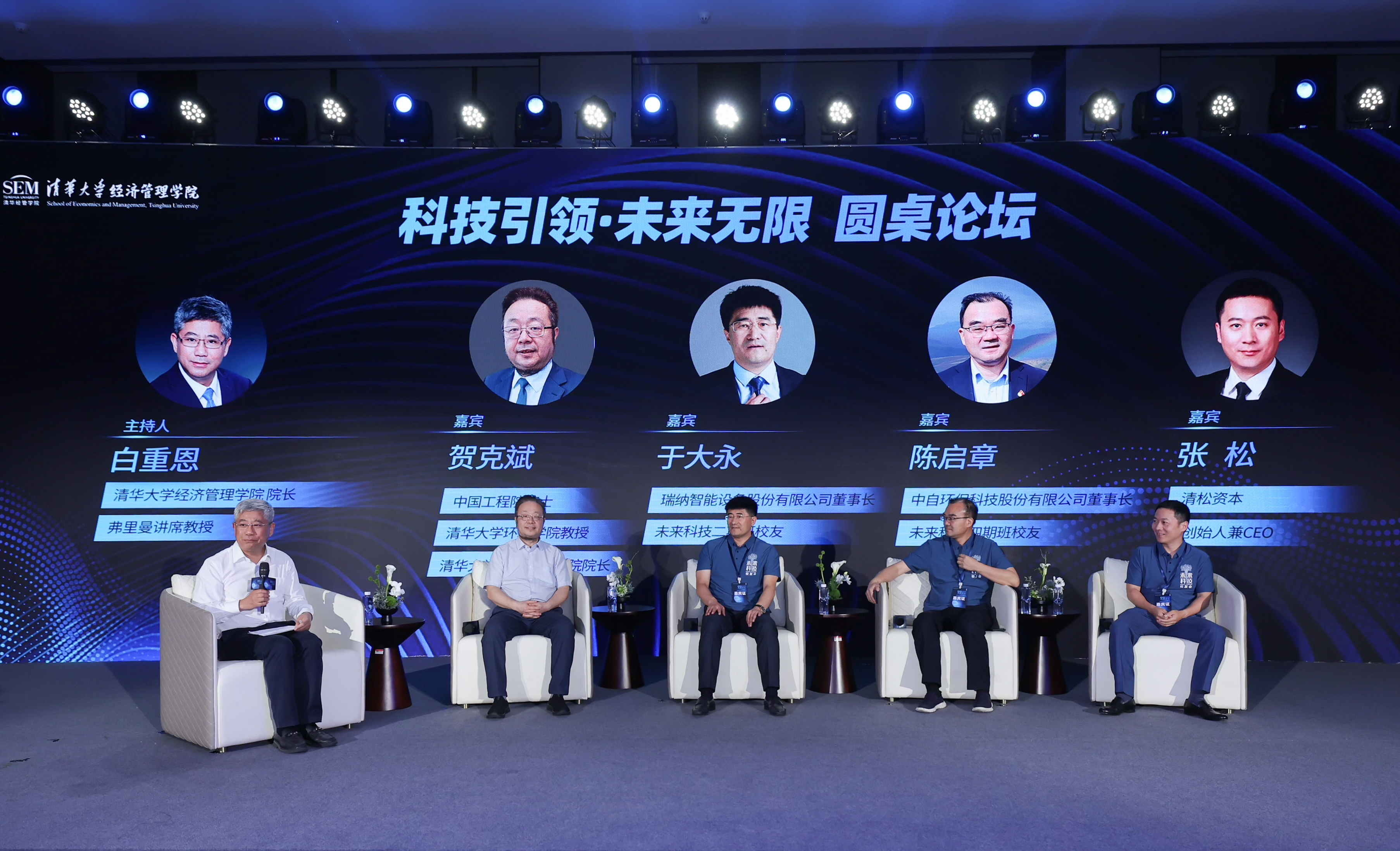 接下来的圆桌论坛由白重恩主持,贺克斌院士,瑞纳智能设备股份有限公司董事长、清华经管未来科技二期班校友于大永,中自环保科技股份有限公司董事长、清华经管未来科技四期班校友陈启章,清松资本创始人兼首席执行官、清华大学生物学博士张松围绕“消纳能力的提升给企业带来的机会”“供暖行业在双碳目标下面临的挑战”“生物技术如何推动双碳目标高效快速实现”“如何建立体系助力高校科技成果转化”等话题展开深入交流。