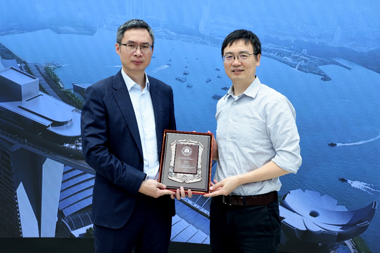 冯雪向陈晓东赠送清华大学“海外名师讲堂”纪念牌