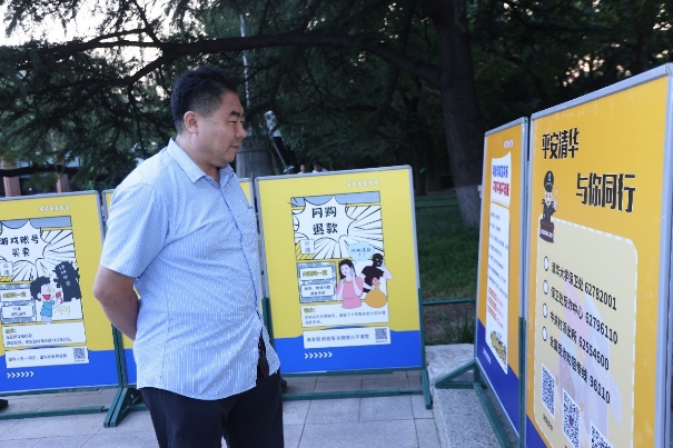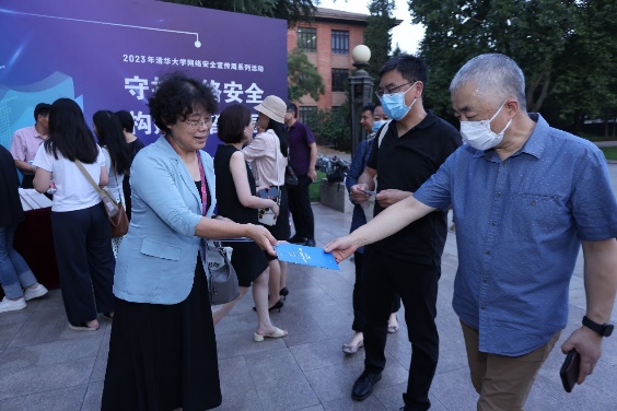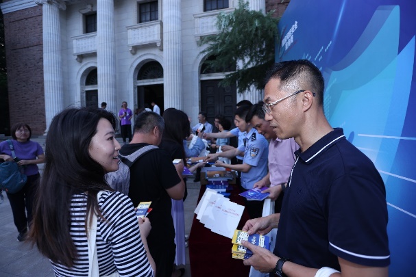 活动现场,中关村派出所干警为大家介绍网络安全和治安知识。工作人员和志愿者为大家发放国家反诈中心《2023反诈宣传手册》《保密宣传手册》、电诈防范主题书签等资料,播放了情景剧式的校园治安宣传片、消防宣传片。