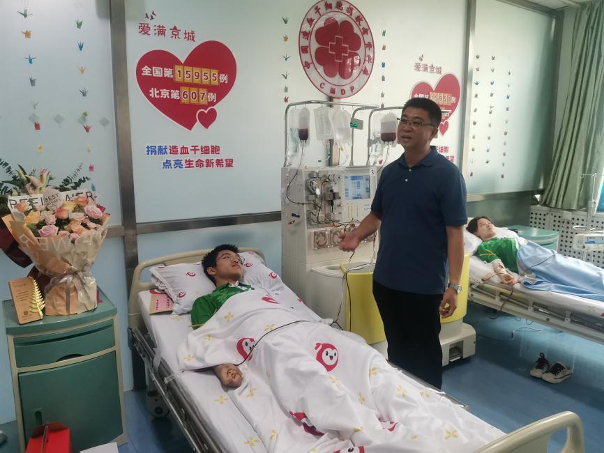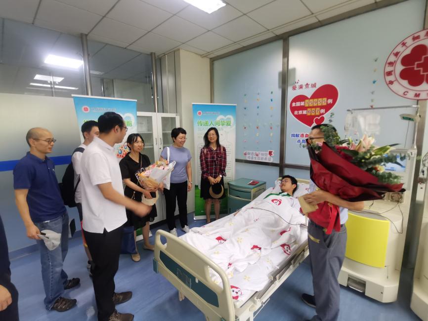 北京市海淀区红十字会副会长夏阳、清华园街道党工委副书记瞿福平、清华大学党委学生部副部长魏晶、巩师远班主任郭增才副教授、清华大学团委副书记程正雨、医学院-药学院党委学生工作组组长王大亮以及学校相关师生到采集室看望并慰问巩师远同学,为他送上鲜花、水果等慰问品。