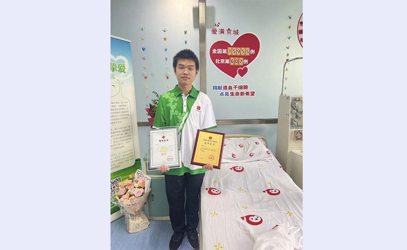 清华新闻网9月18日电(学生通讯员 韩晓彤)9月4日,清华大学医学院2021级本科生巩师远在解放军总医院第五医学中心完成了造血干细胞捐献采集,成为清华大学在校第19例、北京市第607例、全国第15955例造血干细胞捐献者,为一名白血病患者点燃了生命的火种。
