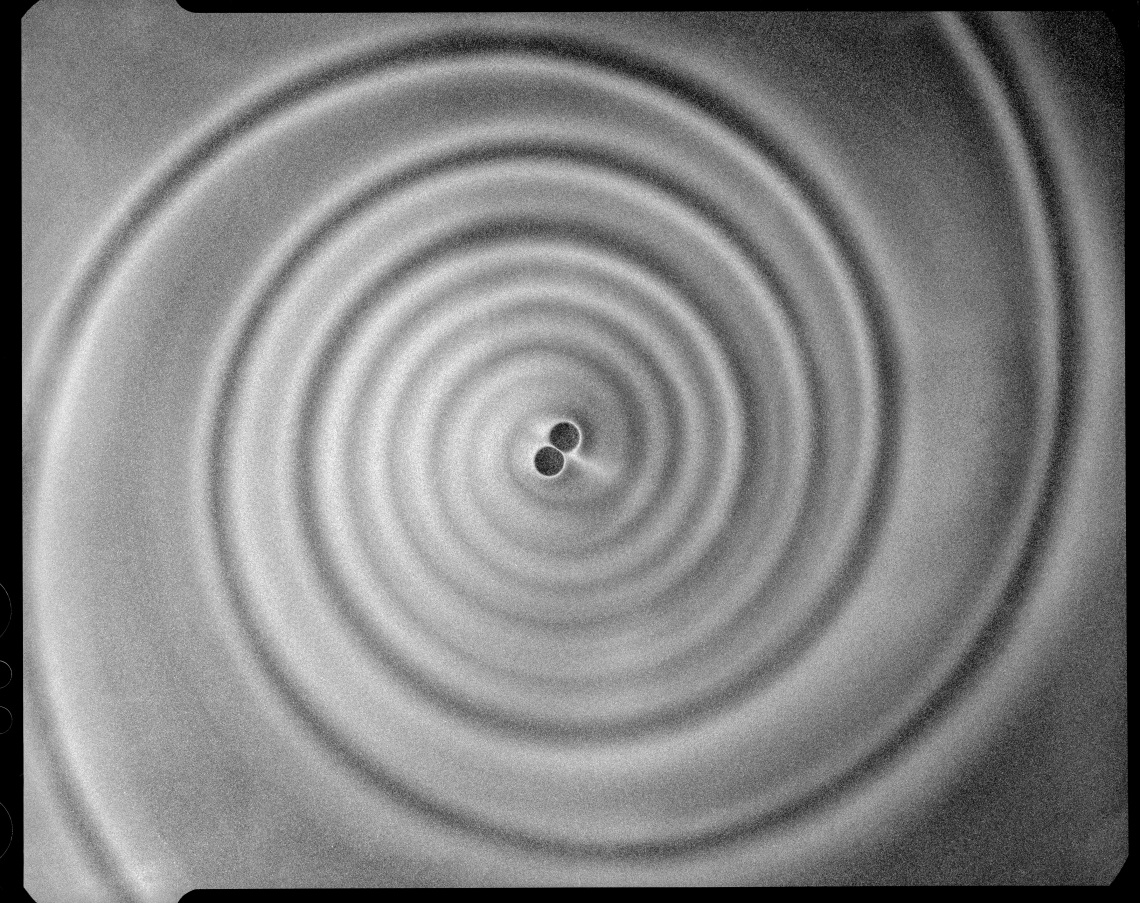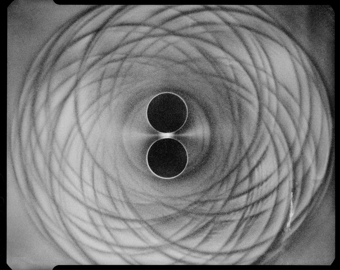 此张照片使用传统大画幅相机“捕捉”到了两颗天体受引力影响从而释放出视觉可见的引力波,在碰撞瞬间产生光晕,是天体间的“决定性瞬间”。
