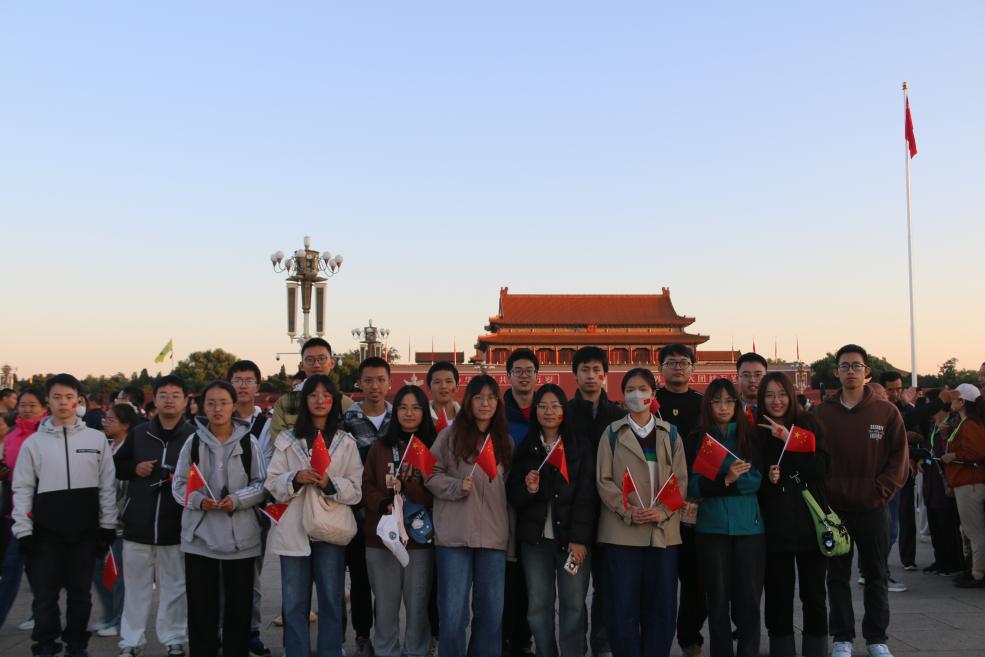 14日凌晨,同学们早早来到天安门广场,等待国旗升起的激动时刻。清晨6时许,国旗护卫队踏着庄严的步伐从天安门城楼走向广场,升国旗仪式正式开始。伴随着雄壮的《义勇军进行曲》,五星红旗冉冉升起、迎风飘扬,在场师生全体肃立、高唱国歌,向国旗行注目礼。之后,大家又随着军乐队演奏的《歌唱祖国》动情歌唱。