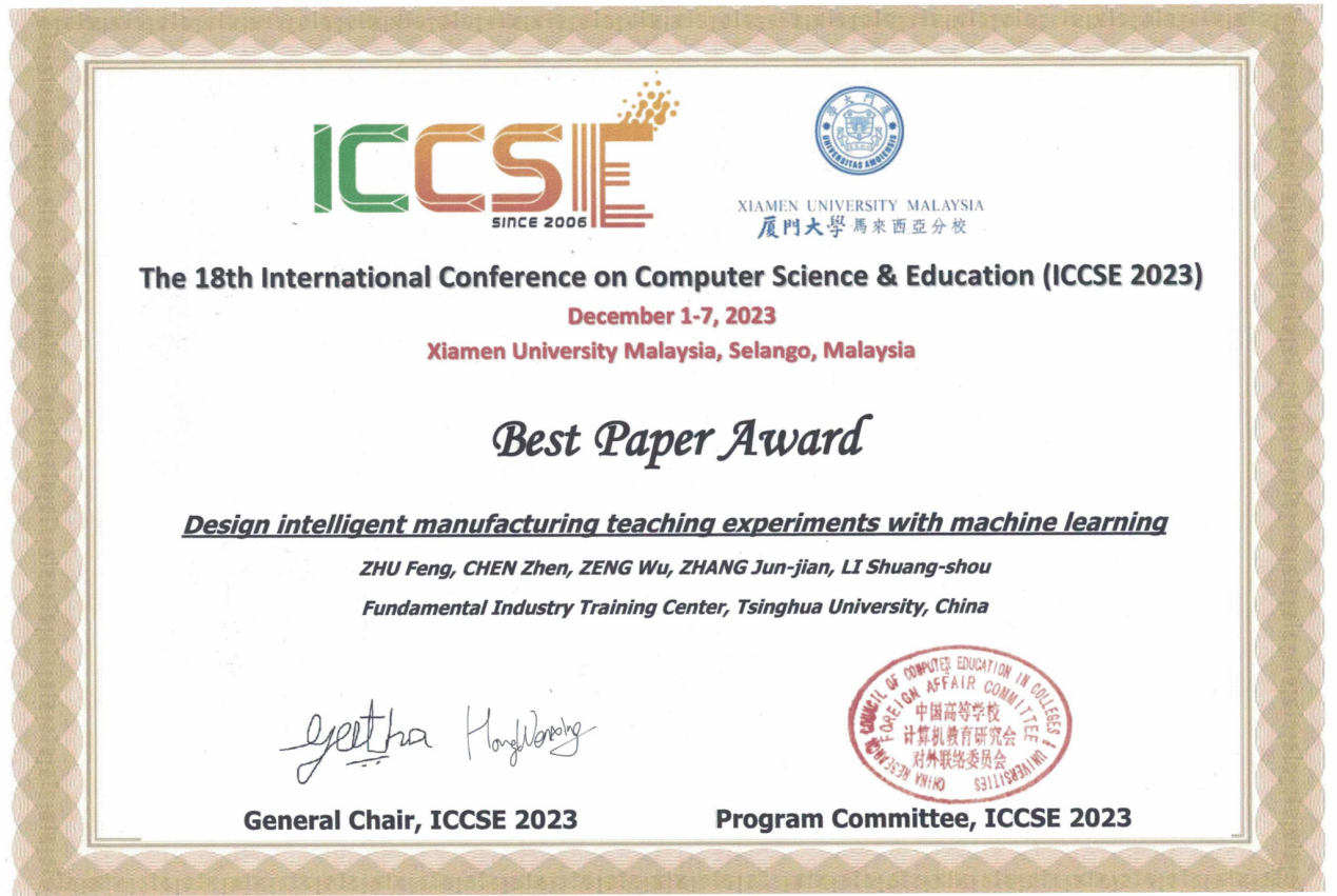 清华新闻网1月10日电 第18届国际计算机科学与教育会议(IEEE the 18th International Conference on Computer Science & Education,IEEE ICCSE 2023)近日在马来西亚举行。清华大学基础工业训练中心教师朱峰、陈震组成跨学科交叉团队,在基础工业训练中心主任李双寿的指导下,基于实践教学研究形成的论文“使用机器学习设计智能制造教学实验”(Design Intelligent Manufacturing Teaching Experiments with Machine Learning)获得最佳论文奖(Best Paper Award)。