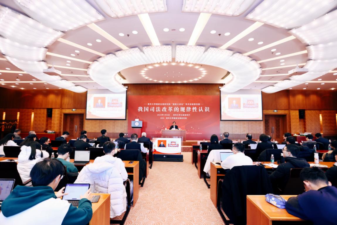 清华新闻网1月11日电 1月6日,清华大学国家治理研究院“国是大讲坛”第四期学术讲座在清华大学主楼接待厅举行。全国人大常委会委员、社会建设委员会副主任委员,中国法学会副会长、中国法学会民事诉讼法学研究会会长景汉朝作“我国司法改革的规律性认识”主题讲座。清华大学党委原常务副书记、校务委员会副主任、清华大学国家治理研究院院长姜胜耀主持讲座。