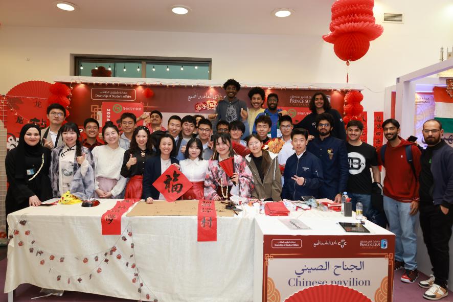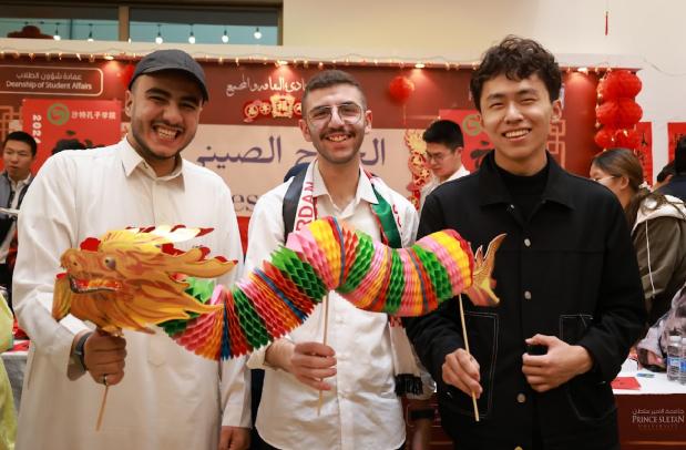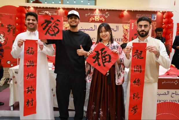 清华新闻网2月7日电 1月29日,“清探沙特”支队在沙特阿拉伯苏尔坦亲王大学开展庆祝春节文化活动。活动开始前,支队同学们与苏尔坦亲王大学孔子学院的老师们精心布置了摊位,红色的灯笼,喜庆的春联,“龙”字背景板营造了浓厚的春节氛围。同学们通过写福字、舞龙、毛笔字教学、二胡、快板表演等形式与当地师生共庆中国春节、展示中国传统文化,活动吸引超过500人参与。
