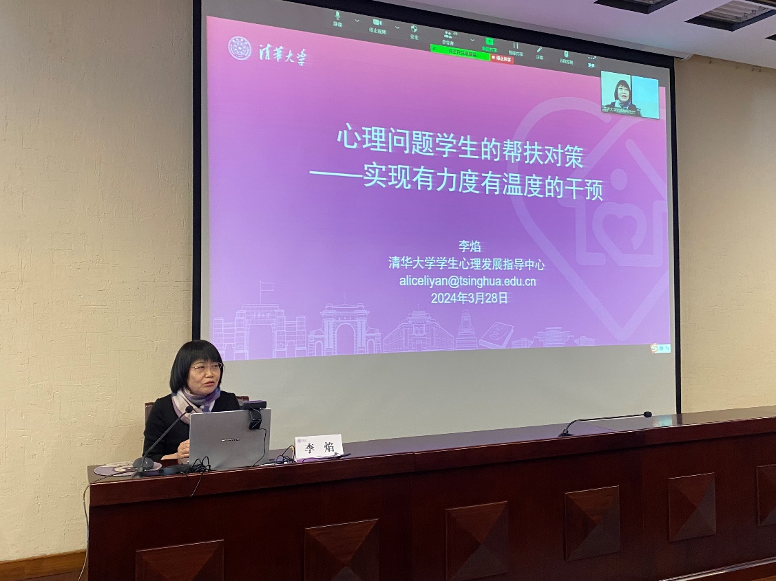 清华新闻网4月1日电 3月28日,由北京市委教育工委组织开展的“心理育人大讲堂”系列培训的首场讲座在清华大学举行。清华大学学生心理发展指导中心主任李焰作题为“心理问题学生的帮扶对策——实现有力度有温度的干预”的讲座。北京市委教育工委宣教处干部王宇航、王浩,清华大学学生部相关负责人等参加活动。