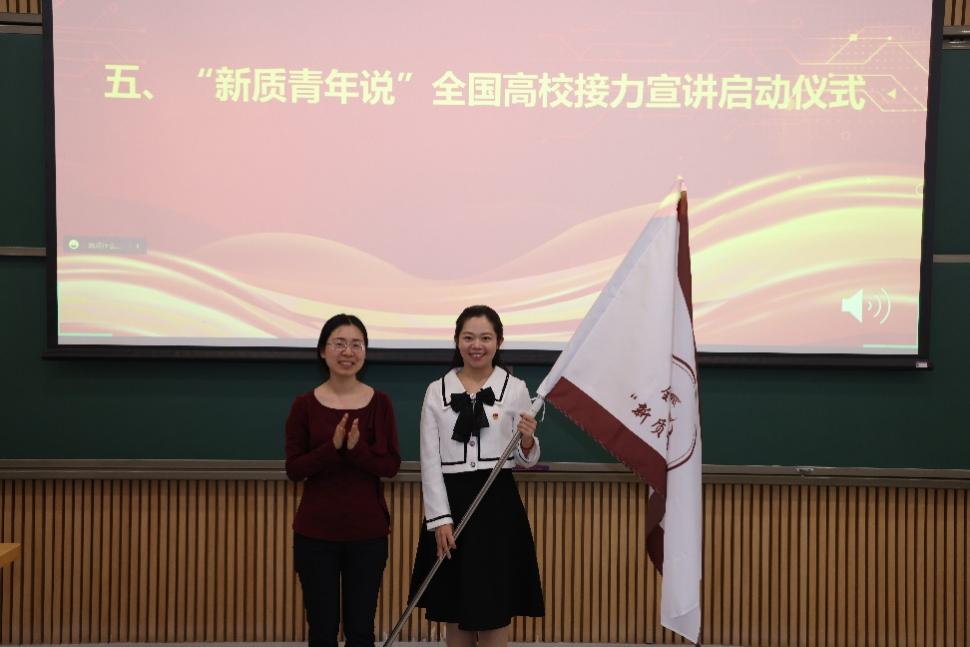 活动最后,清华大学党委研究生工作部副部长兰旻将“新质青年说”接力宣讲旗帜递交给接力宣讲第二场主办方北京航空航天大学宣讲团代表于秋漫。