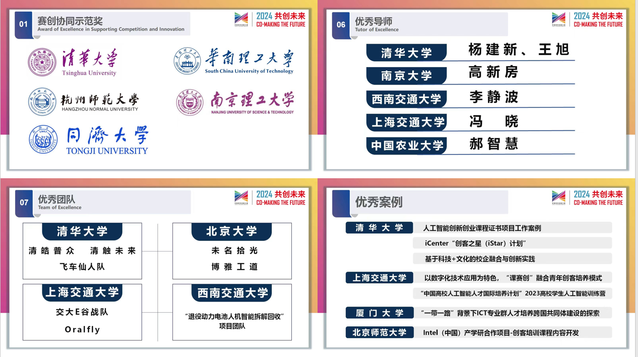 根据2023年度教育部中美青年创客交流中心评估结果,清华大学获得赛创协同示范奖,清华大学基础工业训练中心杨建新、王旭获得优秀导师奖,清华大学“清皓普众”“清触未来”“飞车仙人队”团队获得优秀团队奖,清华大学人工智能创新创业课程证书项目、iCenter“创客之星(iStar)计划”、基于科技+文化的校企融合与创新实践获得优秀工作案例奖。