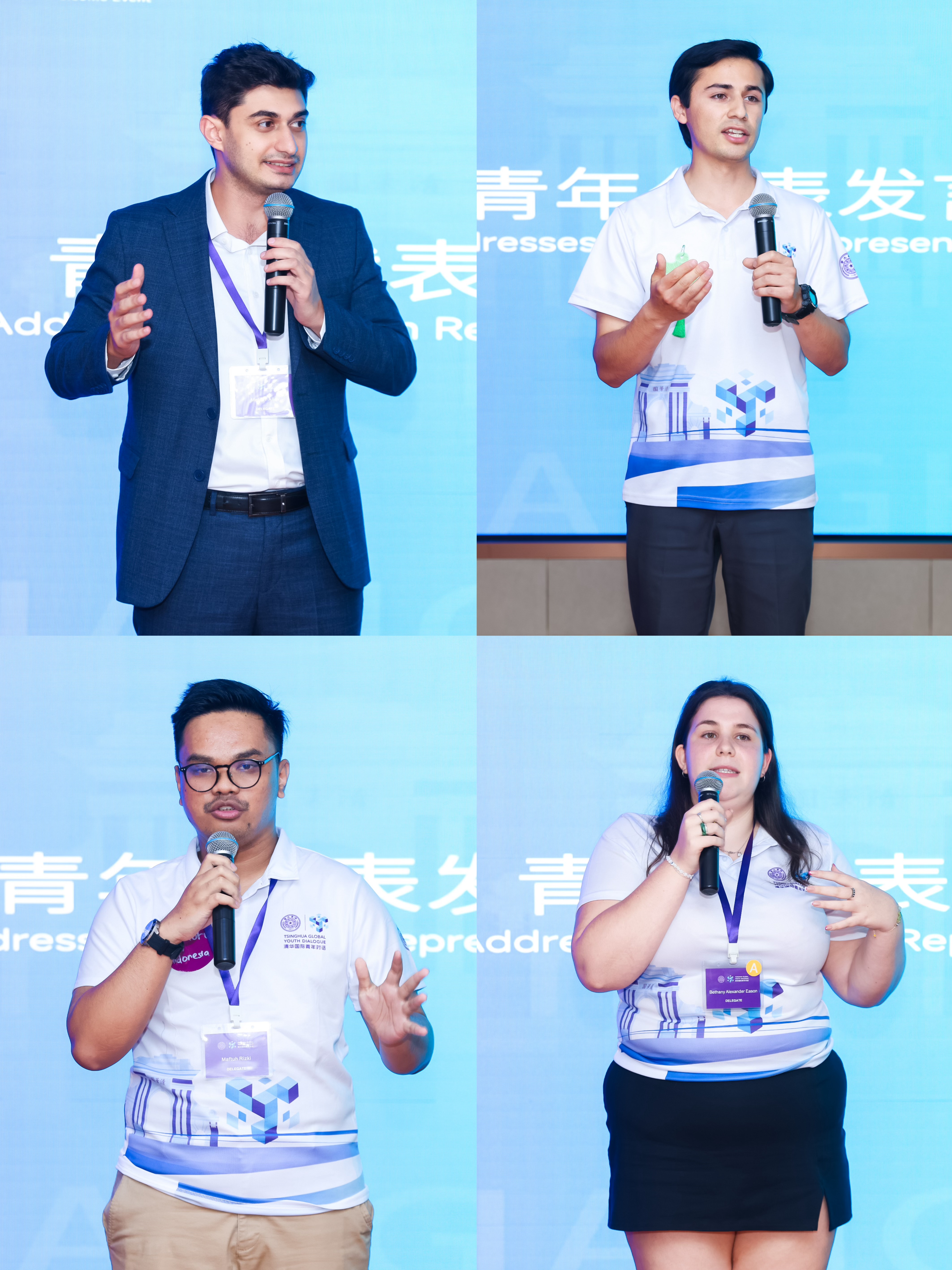 金砖创新基地数字经济研究中心理事兼执行主任、莫斯科国立大学国家大数据中心国际合作部主任宓河力·阿利耶夫(MEKHRI ALIEV),印度尼西亚青年外交官成员马夫图·里兹基(MUHAMMAD MAFTUH RIZQI RAHARDJO),美国麻省理工大学学生威廉·麦克蒂格(WILLIAM JEFFORD VASQUEZ MCTEIGUE),英国爱丁堡大学学生吴北星(BETHANY ALEXANDER EASON)作为青年代表发言。