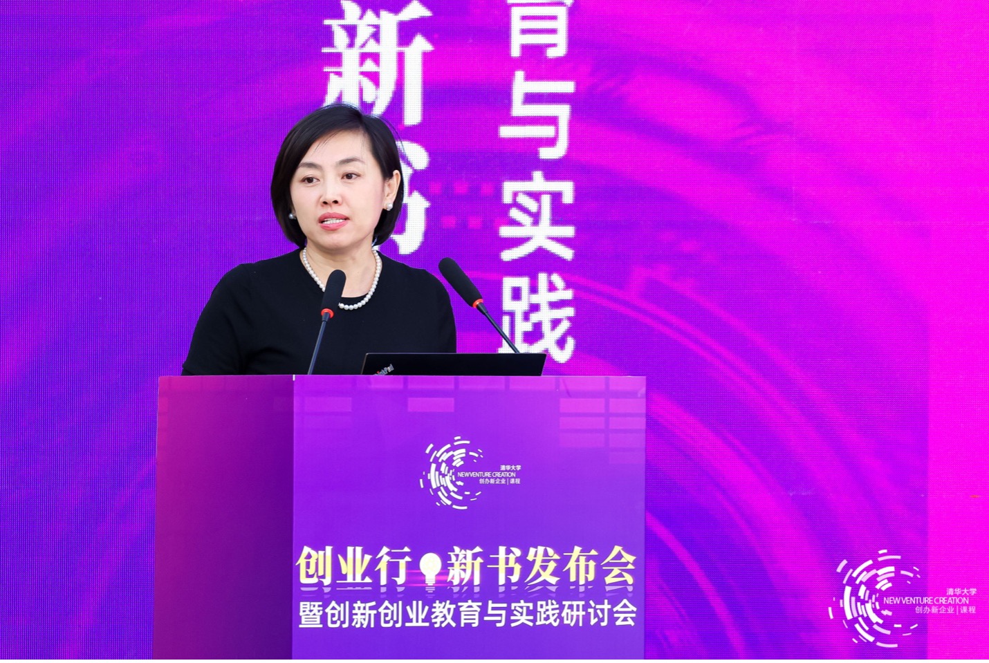 清华大学经管学院创新创业与战略系副主任、副教授张帏介绍了《创业行》一书的编写过程,并以追觅科技创始人俞浩、蓝晶微生物联合创始人李腾两位课程校友为案例,阐述了“创办新企业”课程如何推动人才培养模式的改变。