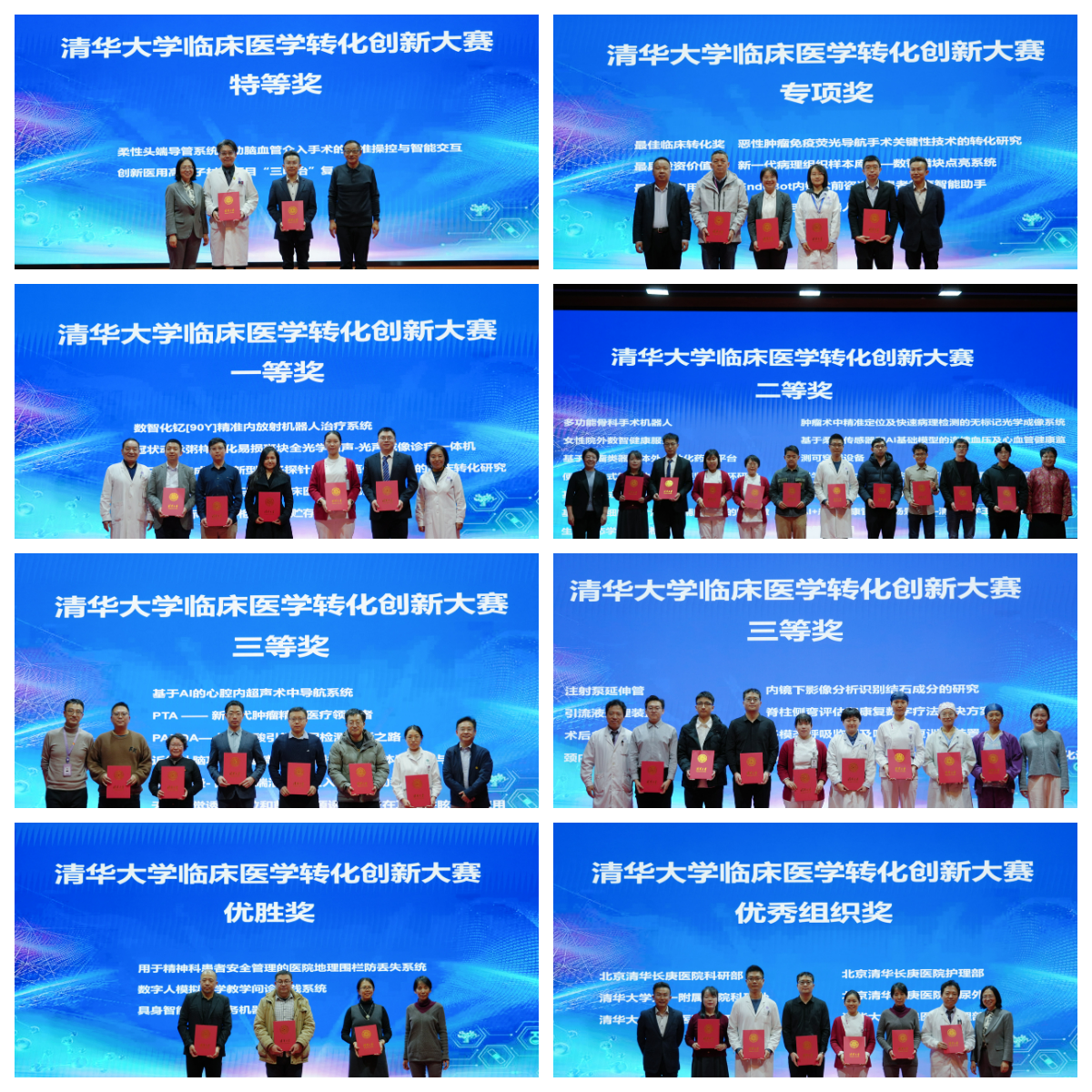 第一届清华大学临床医学转化创新大赛自2024年7月开启,共计60个项目参与,涵盖清华大学15个院系、附属医院20多个科室,涉及人工智能、医学影像等前沿方向。经过初赛和决赛的激烈角逐,一批优秀项目脱颖而出。最终评选出特等奖2名、专项奖4名、一等奖5名、二等奖10名、三等奖14名、优胜奖3名。根据项目组织情况,评选出优秀组织奖6名。