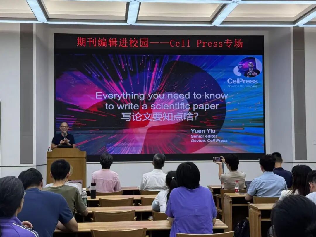 清华新闻网9月4日电 9月1日,图书馆联合科研院、教师发展中心主办的期刊编辑进校园——细胞出版社(Cell Press)专场在图书馆报告厅举行。细胞出版社(Cell Press)旗下期刊《设备》(Device)高级编辑姚远作主题报告,特邀嘉宾《物质》(Matter)、《细胞报告物理科学》(Cell Reports Physical Science)高级编辑李研,以及爱思唯尔(Elsevier)代表王颖参加交流活动。活动由图书馆党委副书记窦天芳主持,50余名师生参加活动。