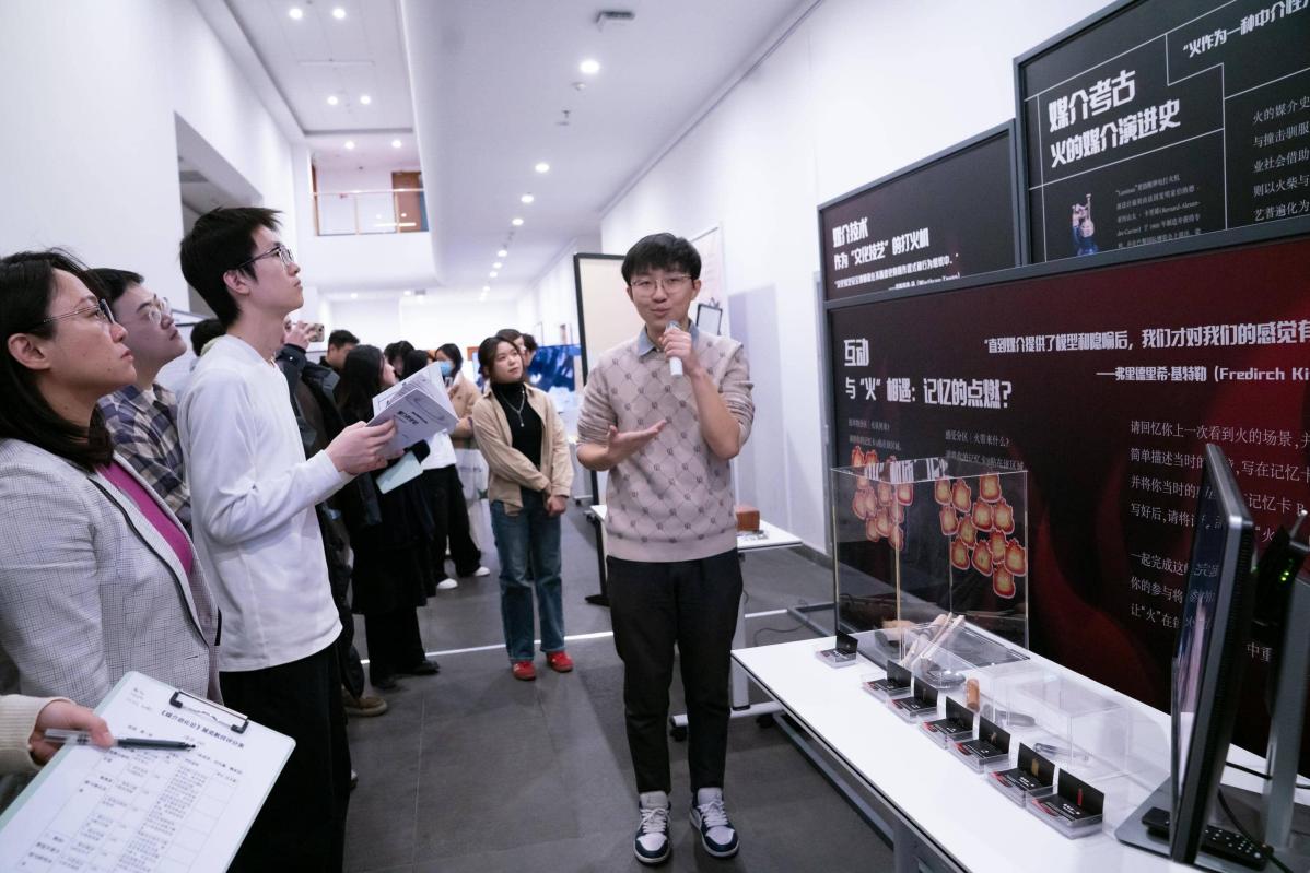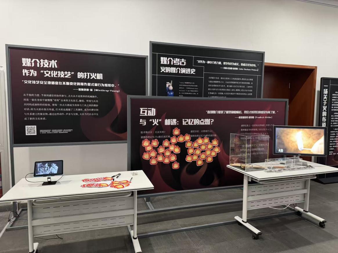 此次展览内容源于吴璟薇的研究生课程“媒介发展史”与科学博物馆资源深度融合后创新教学的实践成果,共呈现六组学生策展成果。在科学博物馆的公共空间内,它们以多个微观视角切入,串联起人类文明的演进——“一场关于火的布道”重现火的媒介史,追溯人类如何在自然元素的操作中塑造自己的文明与生活方式;“日与夜之间”介绍不同的计时仪器如何让抽象的时间“可视化”,以呈现过去人们如何通过星象、流沙来计量时间的变化;借助立体镜与光学装置,“爱丽丝梦游仙‘镜’”让公众了解光学媒介如何通过“观看”影响人们对世界的认知;“指尖的编码”通过打字机与输入法呈现中英文打字机在编码和操作上的区别,并通过网页设计出小程序供观众体验以“明快打字机”为代表的打字机的操作原理;“炮火中的嘀嗒声”以战争时代为背景讲述电报如何传递信息,借助动态演示展示了摩尔斯电码与发报电键的运行奥秘;“电话进化论”展示了电话的演变及其如何不断重塑社会空间。