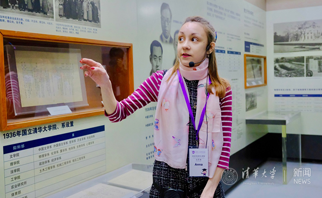 来自中文系本科四年级的俄罗斯籍进修生安娜 (Kuznetsova Anna)承担了本次校史馆讲解活动第二阶段的讲解工作,中文系专业在读的她对中国近代历史有着很一定的了解和很大的热情。安娜在本次讲解中主要负责介绍国立清华大学和西南联合大学阶段的校园历史,她详细地向大家阐述了艰苦战争环境下,清华学子不畏艰苦,勇于斗争,投身于抗日救国运动的先进事迹。清华师生在“一二·九”运动中的先锋作用令在场的国际新生们颇有感触。