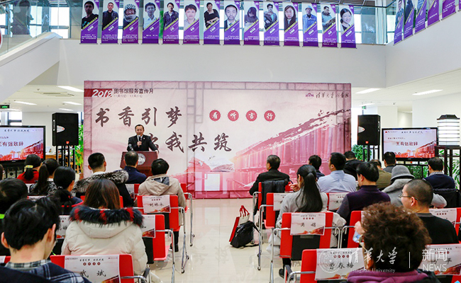 清华新闻网1月4日电 (通讯员 左阳 摄影 姜南)2018年12月27日下午,2018年图书馆服务宣传月闭幕式在北馆(李文正馆)四层举行,清华大学图书馆馆长王有强、图书馆党委书记蒋耘中、图书馆教师顾问、学生馆员、清华大学研究生会代表、学生社团代表以及部分图书馆馆员等出席闭幕式,闭幕式由图书馆副馆长张秋主持。