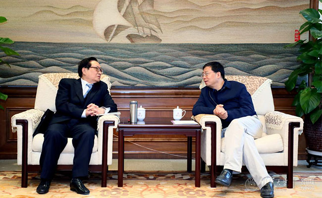 论坛开始前,校长邱勇在工字厅会见了前来出席论坛的十一届全国人大常委会副委员长、1957级合唱队团友华建敏。