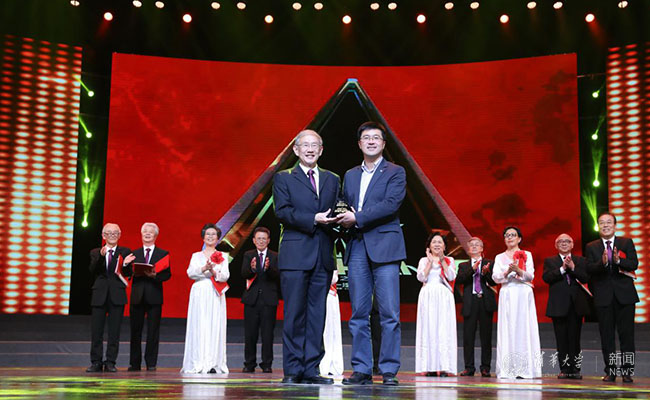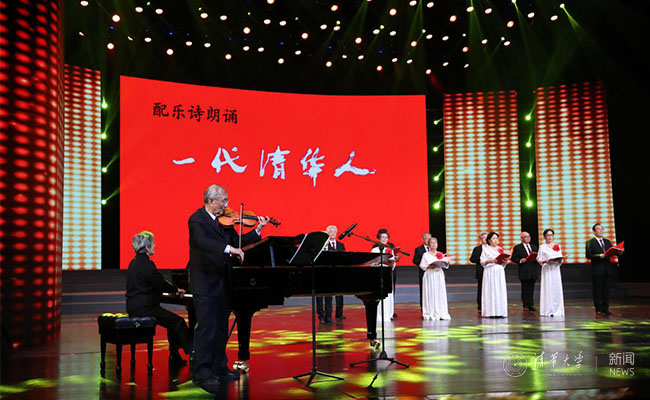 平均年龄72.3岁的清华大学上海校友会艺术团曾以一曲《我爱你中国》唱响央视《出彩中国人》节目。本场演出中,他们以《我爱你中国》的旋律为背景,带来了原创诗歌朗诵《一代清华人》。此次,他们还将获得的荣誉奖杯捐赠给了母校。