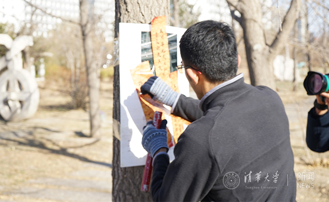 张贴“新华门”地贴的工作人员。