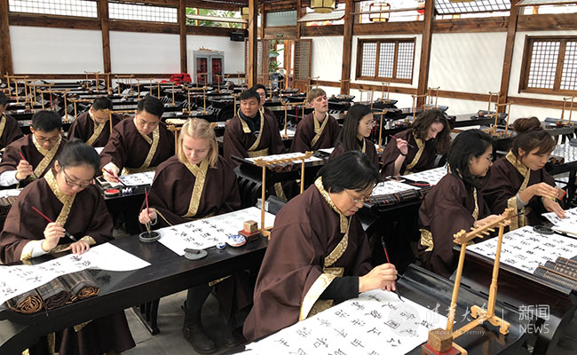 下午,师生们来到汉风耕读苑,深入学习体验中国文化。在文化长廊里,社科学院国际关系学系党支部委员张利华带领中外学生用中文朗读了社会主义核心价值观,并用英文向国际学生详细介绍了社会主义核心价值观的内涵。随后,大家走进国学讲堂,听取中国传统文化介绍并身着中国传统汉服,使用毛笔书写社会主义核心价值观。