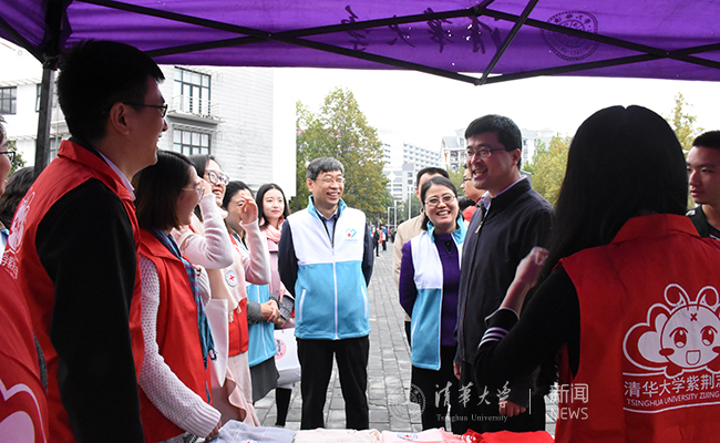 清华大学党委副书记过勇,海淀区副区长、区红十字会会长刘圣国慰问志愿者。余佩旆 摄