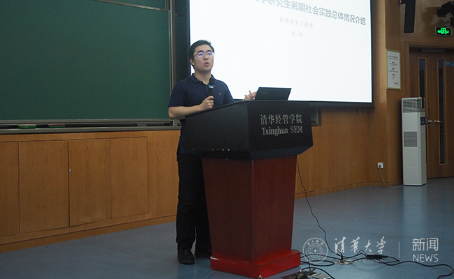 会议开始,经济管理学院2013级博士研究生赵闯围绕“追寻家国理想,奏响发展乐章”的主题,从就业实践的产生过程出发,详细介绍了清华研究生就业实践工作的发展历程,同时介绍了2017年研究生暑期就业实践的出行情况。同时,他也为同学们详实的讲述了知行计划的推出意义以及近两年来知行计划的成果诞生情况。他鼓励实践支队在实践过程中珍惜实践机会,用心去感受、思考,并通过多种多样的形式展示实践成果,有意识的进行创新活动。
