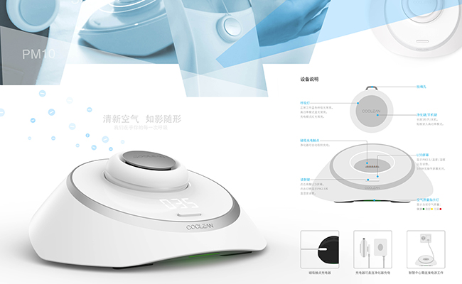 苏艺设计的个人呼吸健康系统相关产品已经成功创业,初创是在清华创客实验室,由清华大学的启迪孵化器、X-lab及i-center共同孵化,团队三位联合创始人和设计师都是清华校友。其团队设计的空气净化系统采用基于电晕的静电除尘技术,通过向空气中发送负离子,能够高效清除1立方米空间中99.9%的颗粒物,无需更换耗材。产品定位于可穿戴式,外观时尚,大小和手表盘相近。此外,产品还配备了智慧中心底座,能监测空气PM2.5及温、湿度。