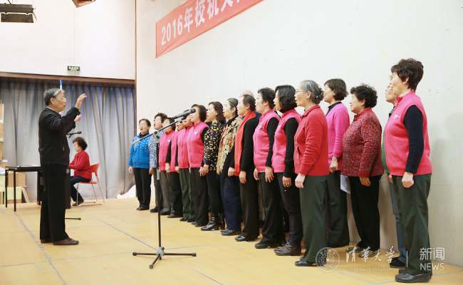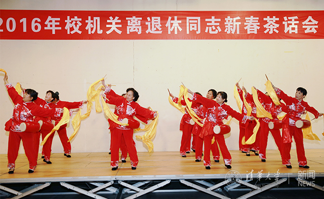 演出在校机关离退休老师健身俱乐部表演的吉祥腰鼓《火火的中国》中拉开帷幕。阵阵腰鼓声响彻整个会场,新年承载新的希望,老同志们与清华大学一起昂首阔步迈向2016年。
