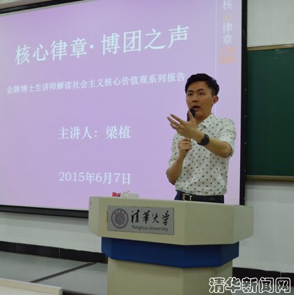清华新闻网6月10日电(通讯员 叶 曼)6月7日晚,清华大学博士生实践服务团(以下简称“博团”)“核心律章·博团之声”金牌博士生讲师解读社会主义核心价值观系列报告第四场举办。新闻与传播学院博士研究生梁植以“演讲的‘新’常态”为题作了主题报告。来自物理学院、材料学院、公共管理学院、马克思主义学院等院系的同学聆听了本场报告。